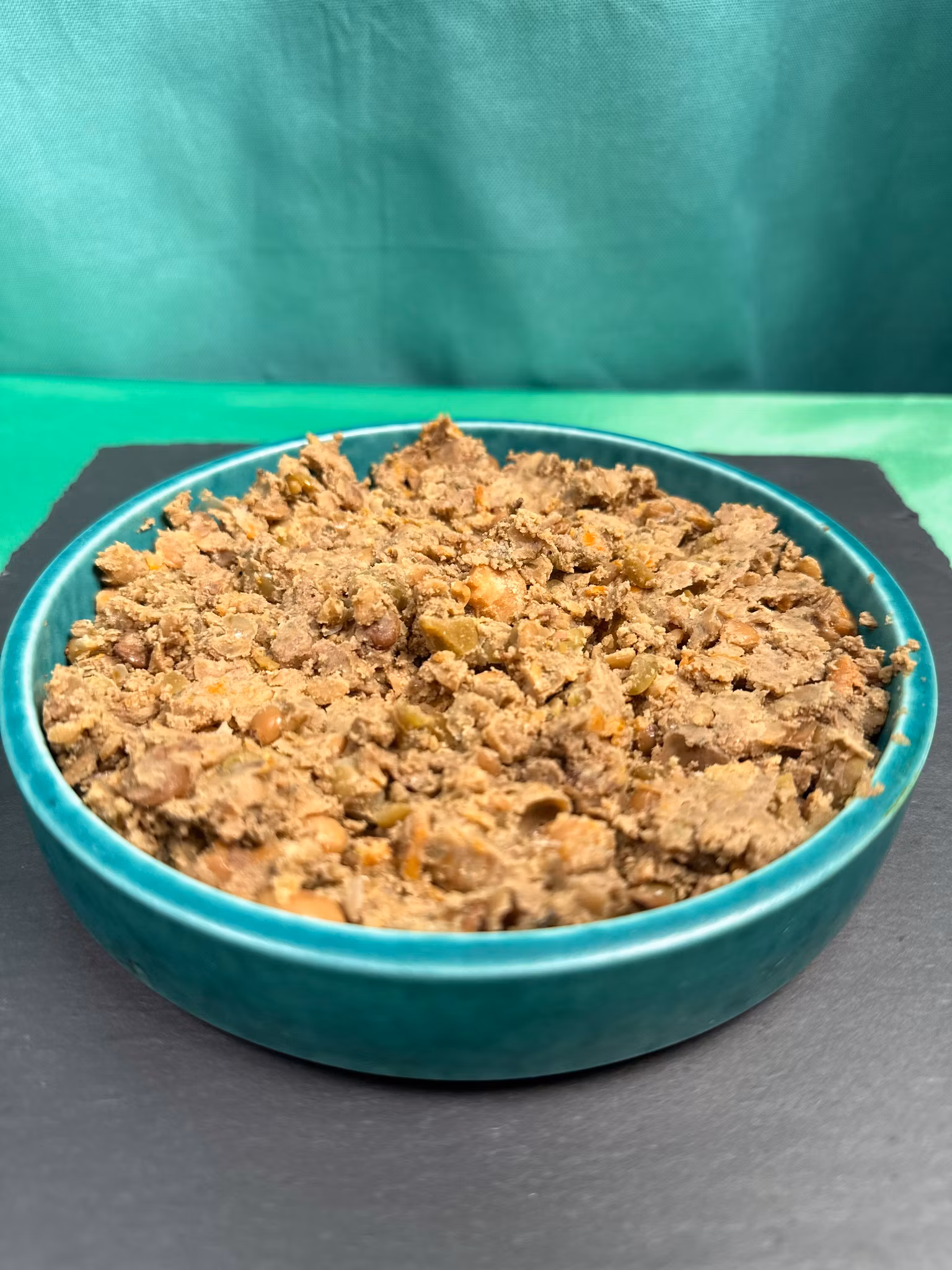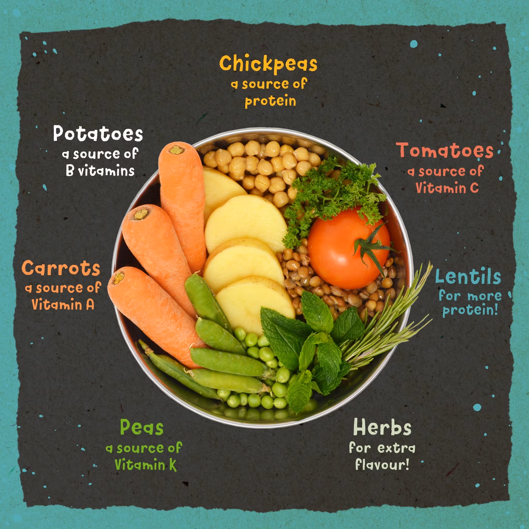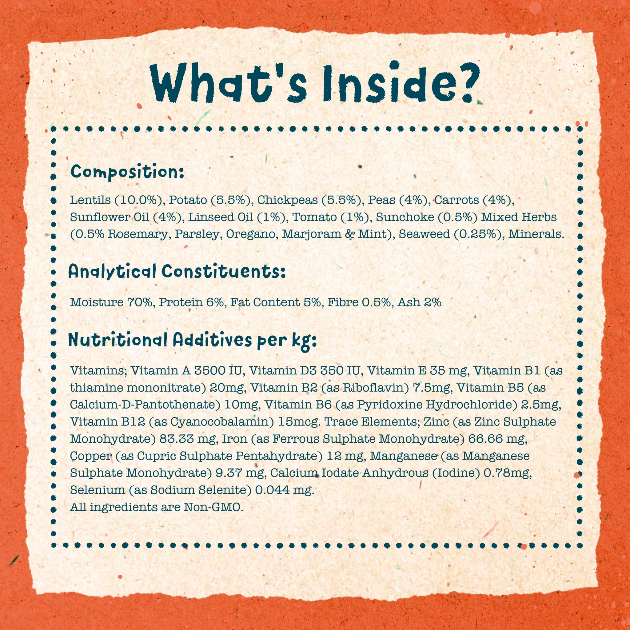 Linser (10,0%), Potatis (5,5%), Kikärter (5,5%), Ärtor (4%), Morötter (4%), Solrosolja (4%), Linfröolja (1%), Tomat (1%), Jordärtskocka (0,5%), Blandade örter (0,5% Rosmarin, Persilja, Oregano, Mejram och Mint), Tång (0,25%), Mineraler.