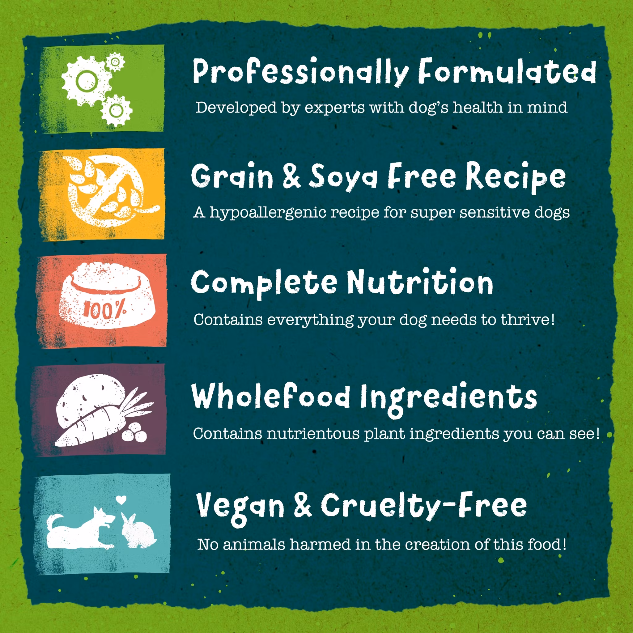 Helt fritt från spannmål, kött, vetegluten, soja, tillsatt socker, gm-ingredienser, konstgjorda färg- och smakämnen. Detta är ett utmärkt allergivänligt foder som är skonsamt och lättsmält, perfekt för hundar som lider av matkänslighet och allergier.