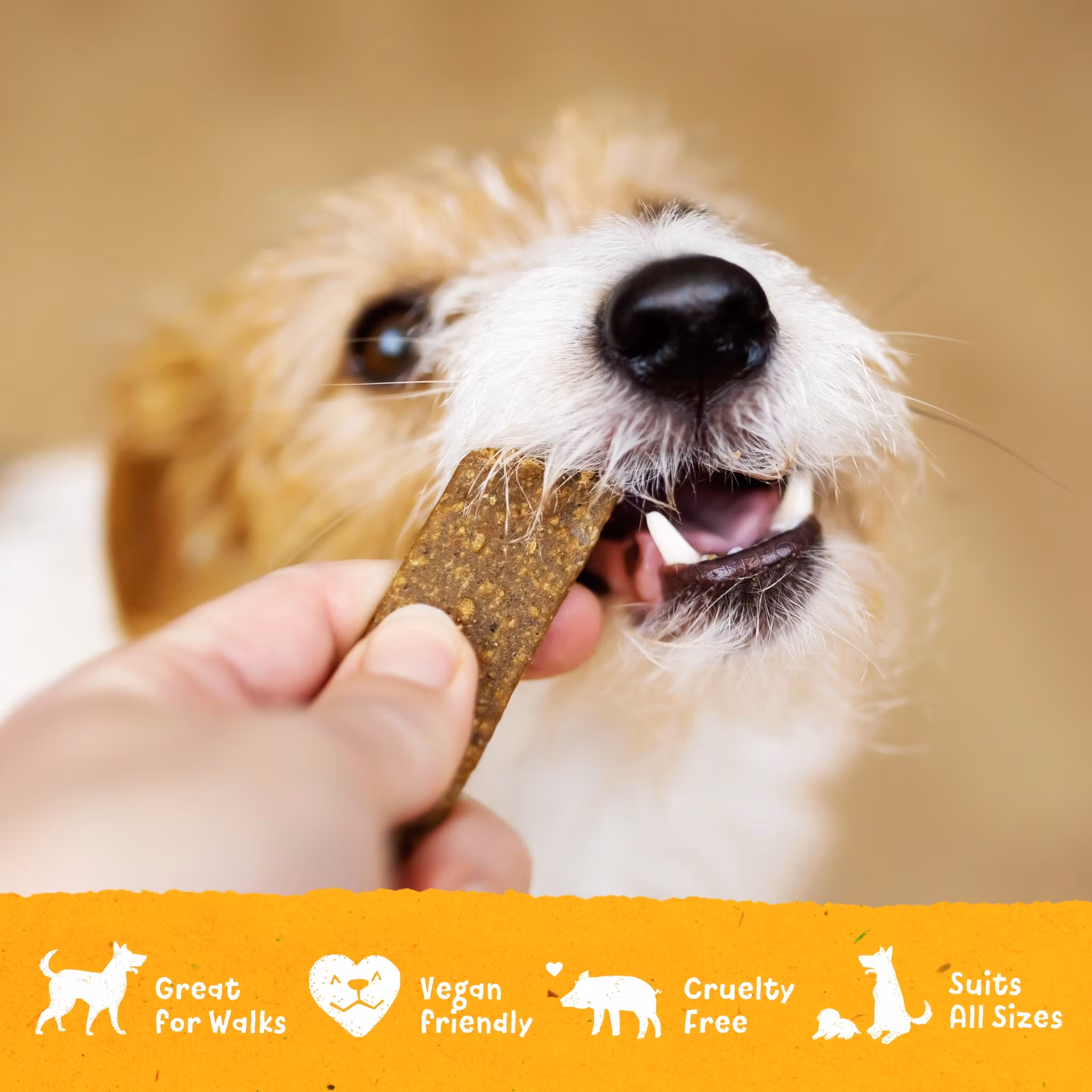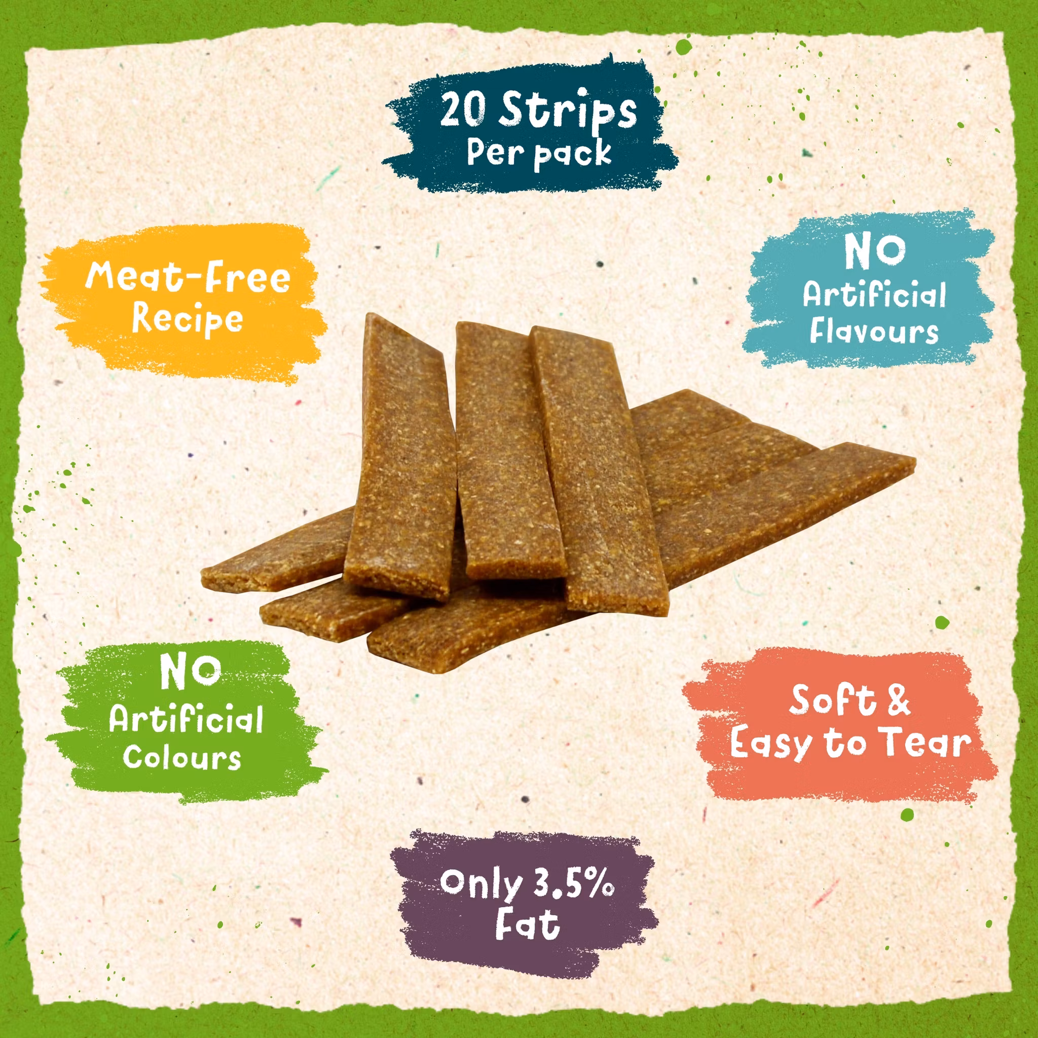 Rumble strips är mjuka, växtbaserade tuggbitar som enkelt kan delas i mindre bitar och användas som t.ex. belöningsgodis och passar därför hundar i alla former och storlekar. Dessa växtbaserade hundgodis är en utmärkt hypoallergen belöning, idealisk för hundar som lider av matkänslighet och allergier.