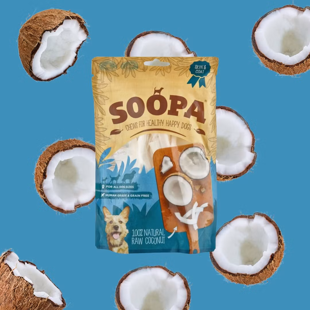 Soopa Coconut Chews är handskurna torkade kokosbitar som innehåller fibrer, vitamin E, mineraler och antioxidanter och främjar upptaget av magnesium och kalcium vilket hjälper hunden att utveckla starkt skelett och friska tänder. men inte bara det, kokos är också bra för hundens immunförsvar, hud och päls.