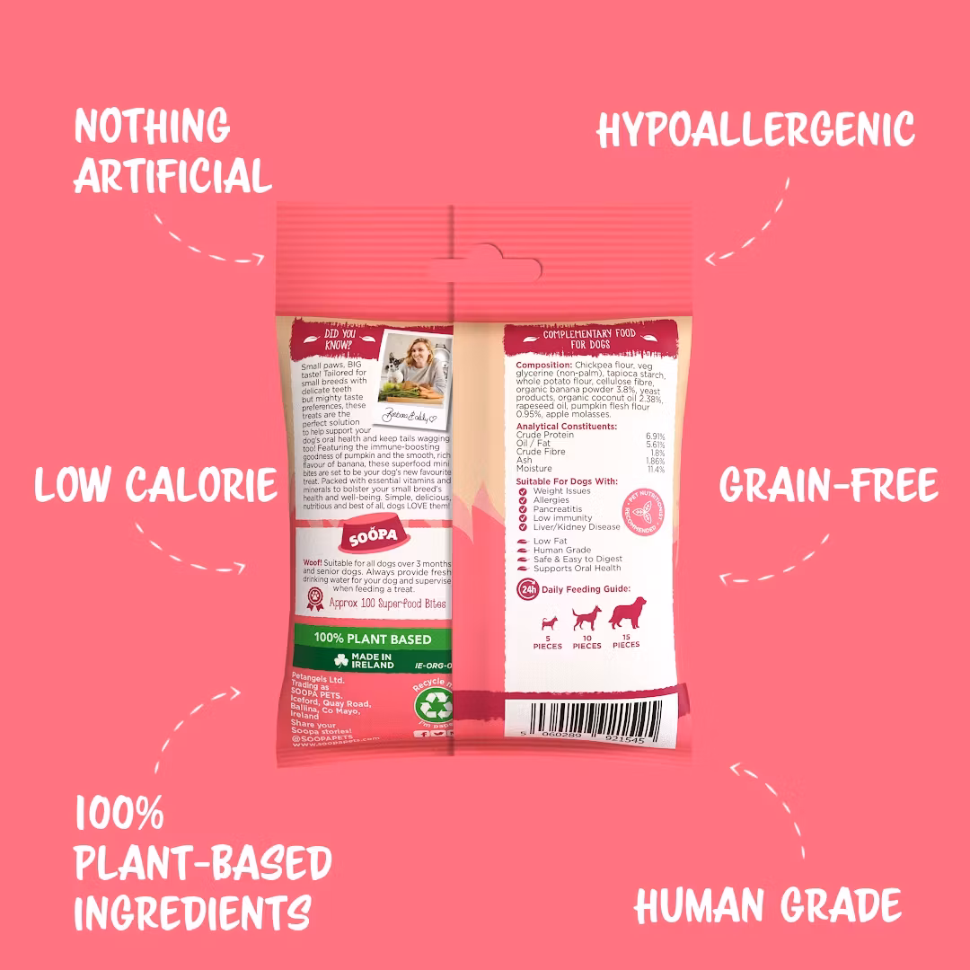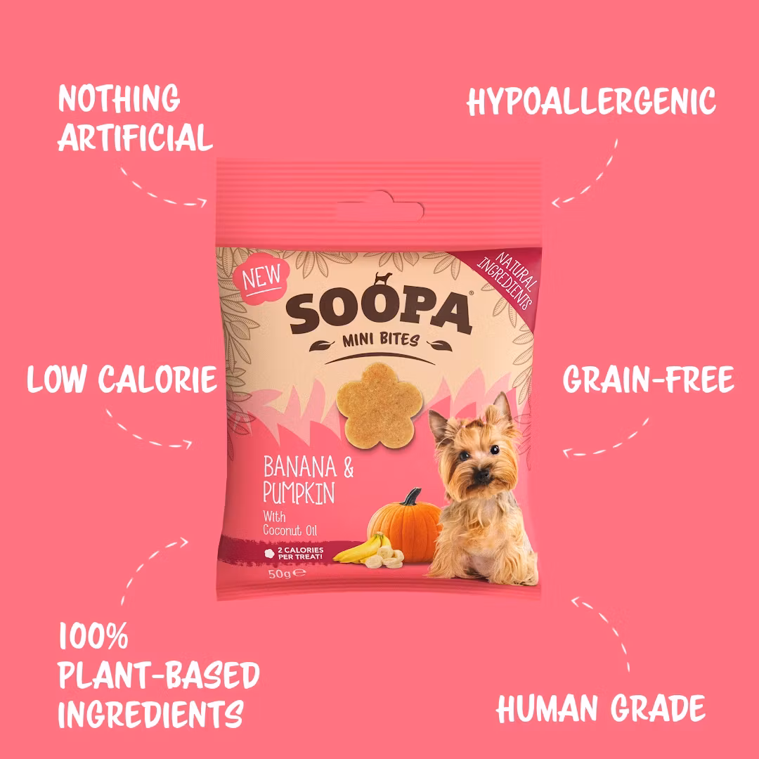 Soopa Mini Bites / Banana & Pumpkin är en av många smaker av deras spannmålsfria belöningsgodis. Allergivänliga, lättsmälta och låg i fetthalt och just dessa är tillverkade för de allra minsta hundarna.