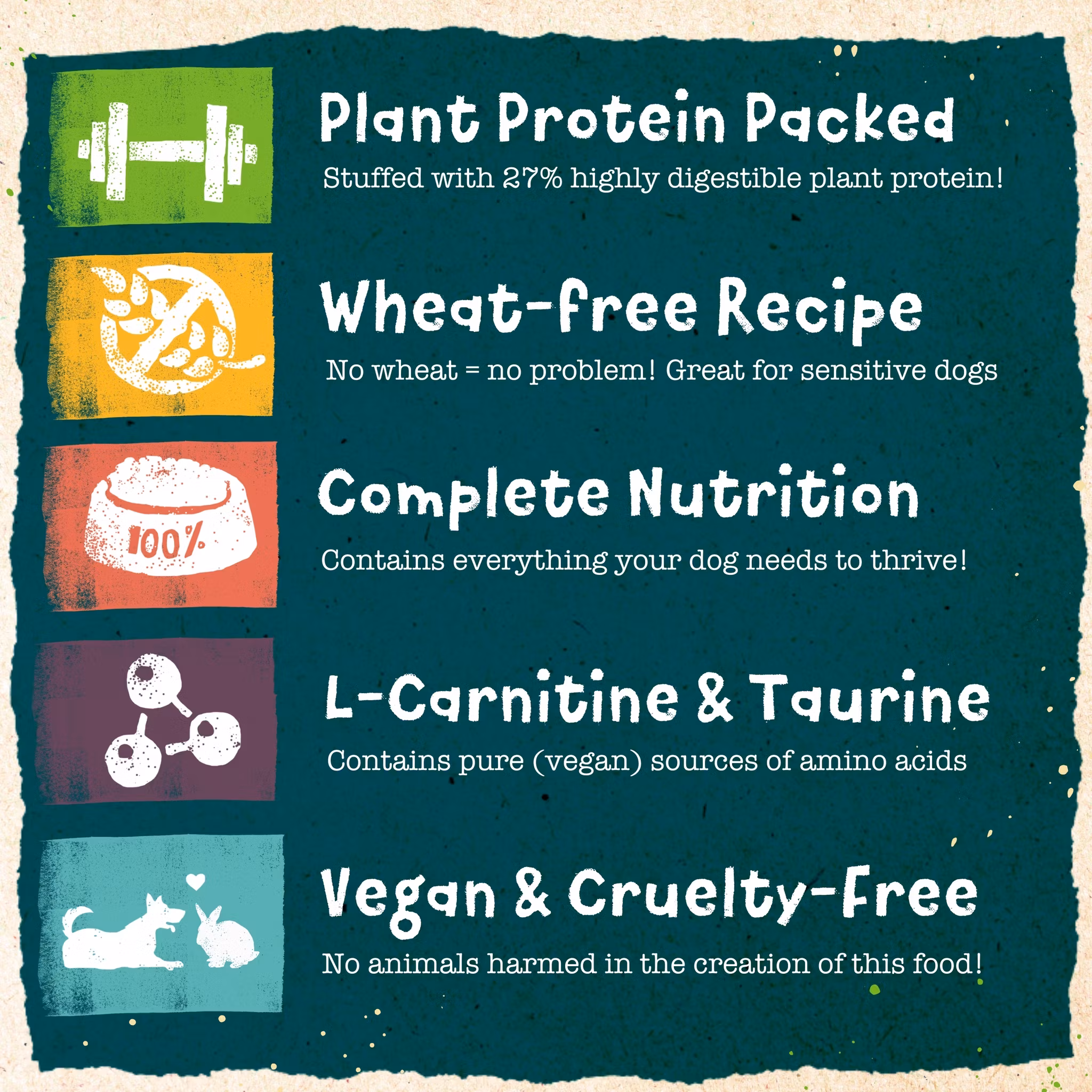 Denna växtbaserade hundmat är skapad från en balanserad kombination av högkvalitativa växtbaserade ingredienser och innehåller 27,5% protein samt är berikad med en rad vitaminer och mineraler.