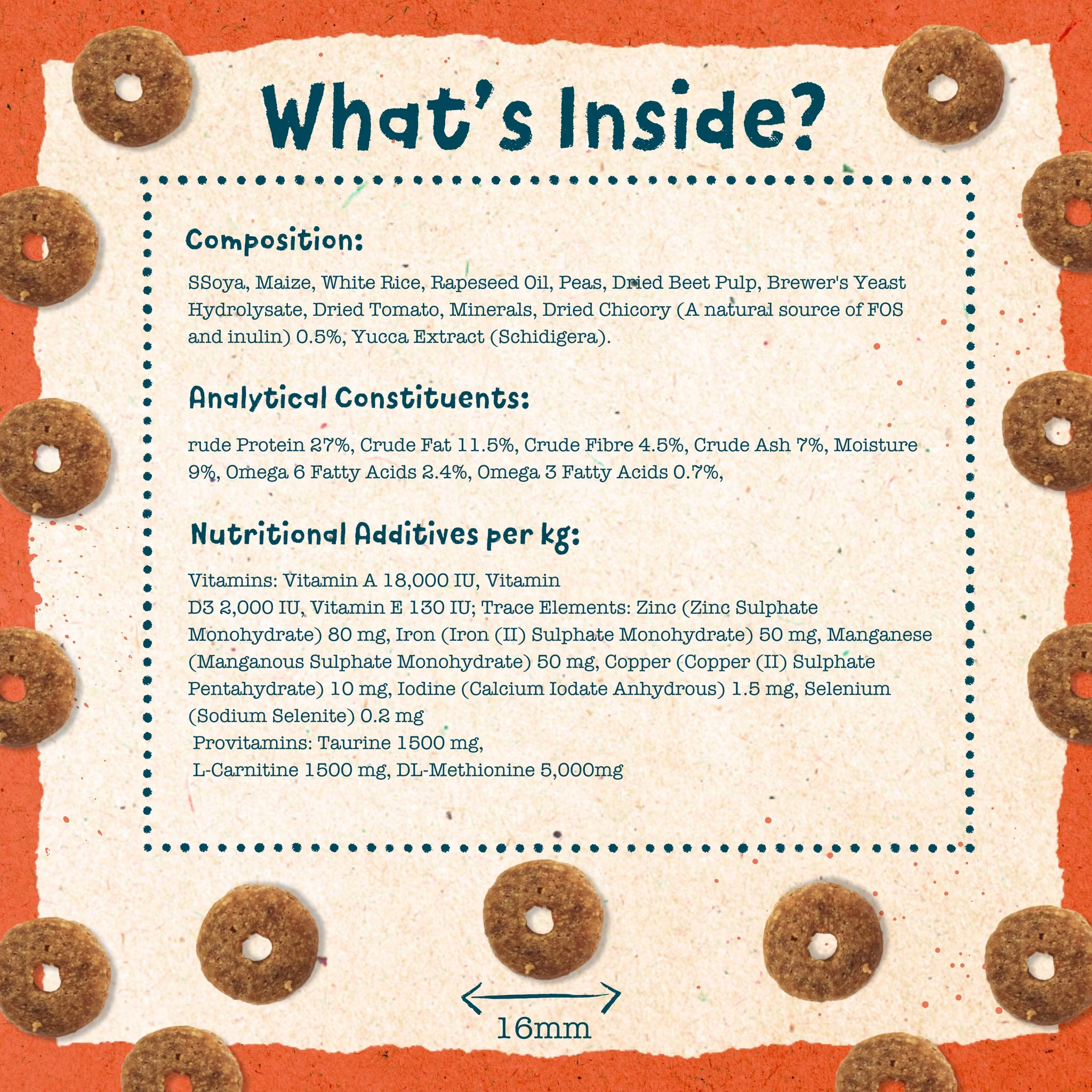 Soja, majs, vitt ris, rapsolja, ärtor (7%), betmassa, öljäst, mineraler, tomatrester, grönsaksbuljong, Yucca Schidigera-extrakt (0,1%), frukto-oligosackarider (prebiotisk FOS) (0,01%).